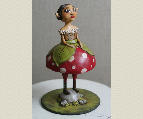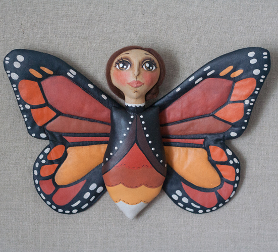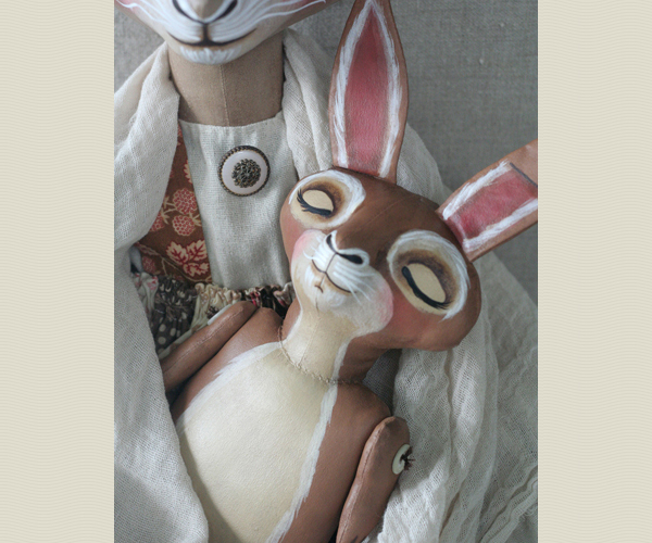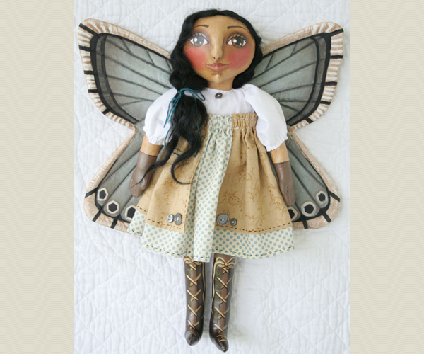 Fabric, paperclay and paint are her favorite mediums. Many of her dolls are made entirely from cloth that has been painted and sanded in multiple layers. Every doll Rebecca makes is of her own design. She uses no patterns other than her own drawn pattern pieces to construct cloth dolls. Her paperclay sculptures are hand-sculpted without the use of any molds. Each one of a kind piece will become a family heirloom and is a result of hours of stuffing, needle-sculpting, stitching, painting, needle-felting, sanding, aging and sculpting.